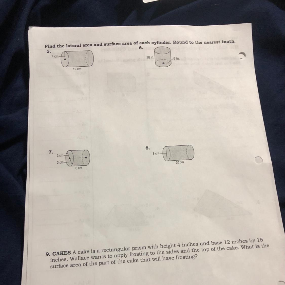 8. LA = 502.7 sq. cm., SA = 603.2 sq. cm.