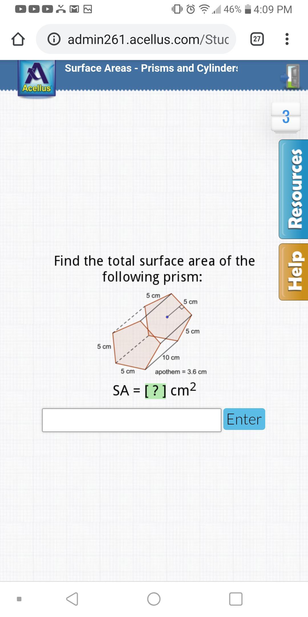 Now that we have the area of the front and back pentagons, as well as the area of all the sides of the prism, all we need to do is add them all up together to find the total surface area.