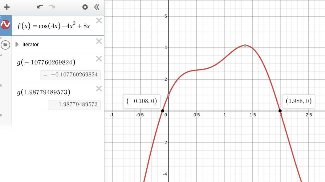 The calculator we used is interactive, so the value of g(x) is found even as you type the argument value x. That makes it possible to achieve full calculator accuracy for the root estimate simply by copying the approximate value into the expression g(x).