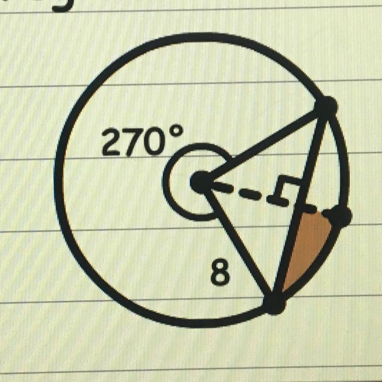 Step-by-step explanation:There are three lines from the center to the sides. So they are all the same. you can see that the radius is 8 from one of the sides. You can find the area of the big triangle by knowing that 2 of the sides are 8 and 360-270=90 and that is a right triangle so we can use the pythagorean theorem to find the hypotenuse. 8^2+8^2=√128. And we can find the area by doing (8^2+8^2)/2=32 so each triangle is 16 units^2. To find out the lengths of the left triangle we have (.5*√128)^2=√32. So 8^2-32=x² x=√32. if the radius is 8 and the one side of the radius is √32 it would be 8-√32. and the other line touching the shaded area it √128 so we can say that the area of the non-little circle is the area of the whole circle-the almost circle. The area of the whole circle it 8^2*pi≈201.06. The area of the almost circle is 201.06*.75=150.79 because 270/360=.75 plus the area of the triangle (32) so the area is 182.79. So the area of the little thing is 201.06-182.79=18.27 divided by 2 =9.13