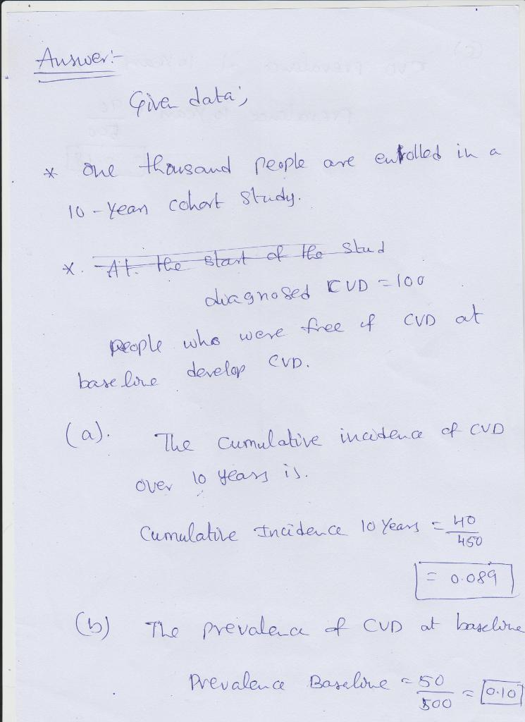 f the study, 80 people who were free of CVD at baseline develop CVD.1. What is the cumulative incidence of CVD over 10 years?Cumulative Incidence 10 Years =_______2. What is prevalence of CVD at baseline?Prevalence Baseline =________3. What is the prevalence of CVD at 10 years?Prevalence 10 Years =_______