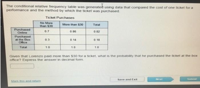 The conditional relative frequency table was generated using data that compared the cost of one ticket for a performance and the method by which the ticket was purchased.