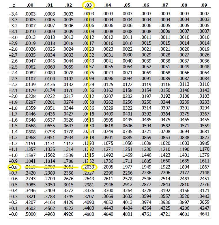 In the table the value of Z is divided into two, the integer and first decimal are found in the first column of the table and the second decimal value is found in the first row of the table, where these cross you'll find the corresponding probability.
