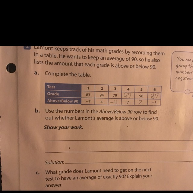 you can think of it this way, if he had 90 on all 6 tests, the above/below row will show 0, 0, 0, 0, 0, 0. If any of the tests was above 90, that row will yield a sum more than 0, and if any of the tests were below, that sum will be a negative value.
