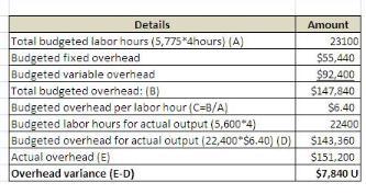 turing overhead costs $92,400 Fixed manufacturing overhead costs $55,440 Normal production level in labor hours 30,800 Normal production level in units 5,775 Standard labor hours per unit 4 During the year, 5,600 units were produced, 18,340 hours were worked, and the actual manufacturing overhead was $151,200. Actual fixed manufacturing overhead costs equaled budgeted fixed manufacturing overhead costs. Overhead is applied on the basis of direct labor hours. Fergie's controllable overhead variance is