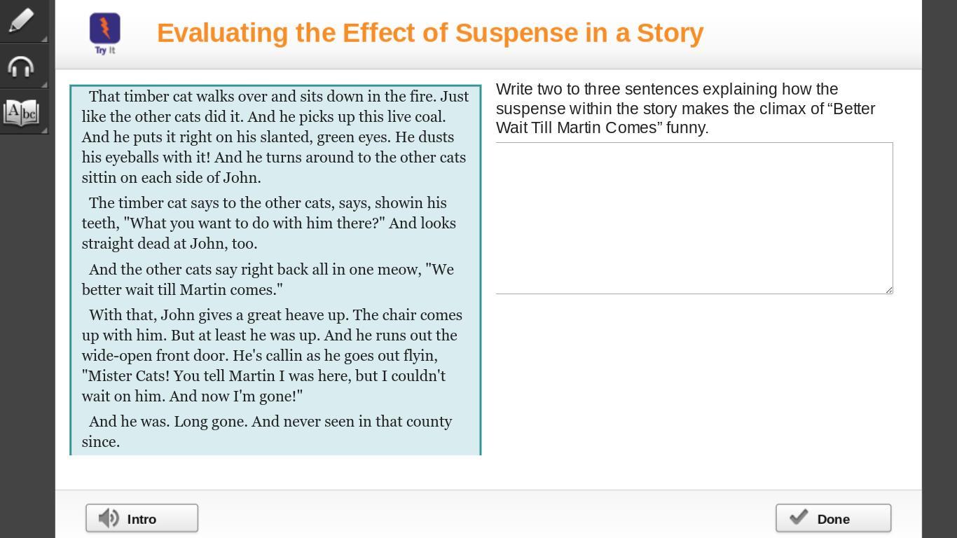 Answer: The suspense in the story grows when Martin falls through the seat of the chair and becomes stuck. The reader fears for John since each new cat is bigger than the one before, and the reader is concerned that John won't be able to escape once Martin gets there. The situation seems more and more incorrigible for John, so it is hilarious when John breaks the suspense by making a funny comment and running away with a chair stuck to his rear.