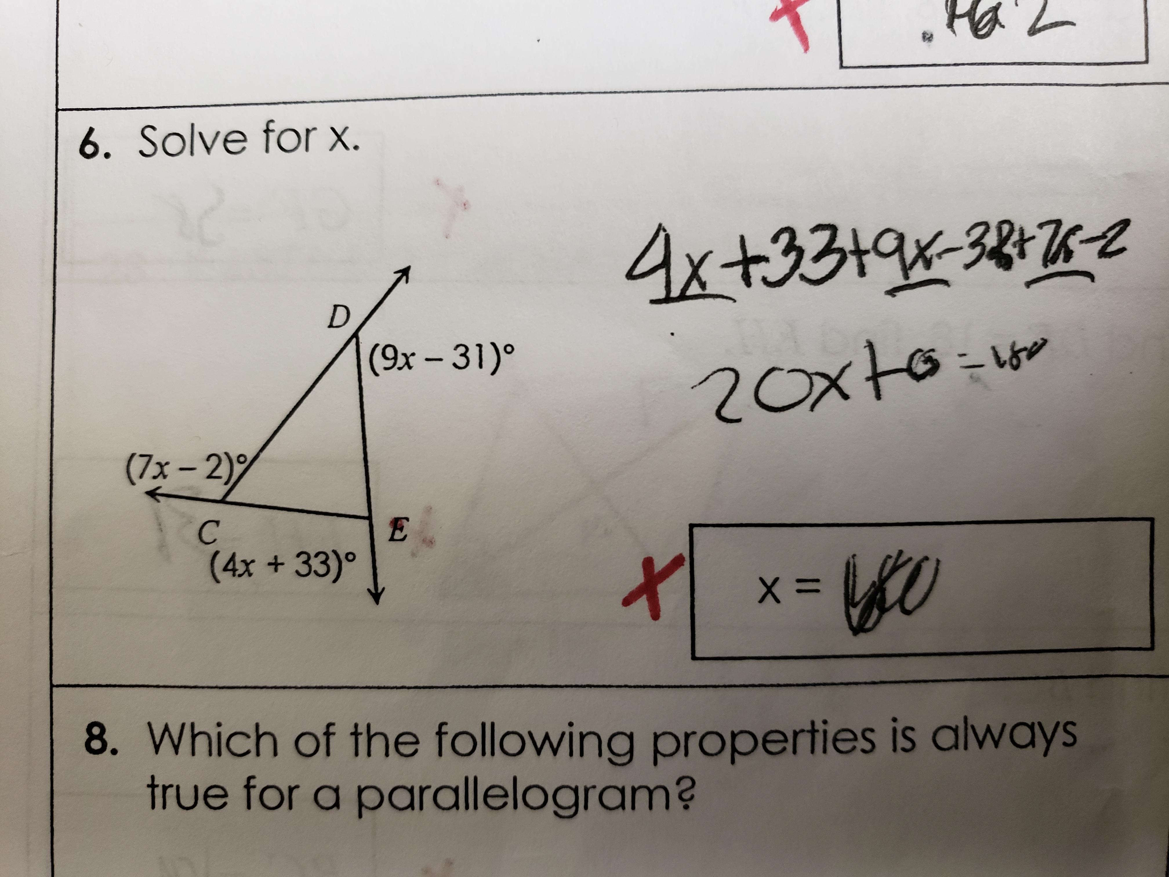 ∠ E = 180 - 4x - 33 because they are supplementary angles. And these angles add up to 180 degrees.