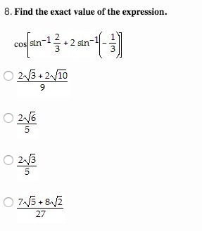 . Now, since sin and inverse sin undo each other, sin of the inverse sin of 2/3 is 2/3. One more to go...For