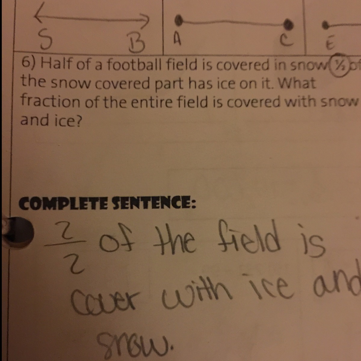 The answer is 1/2 because it's asking for the fraction that has both ice and snow, but only half of the field covered in snow has ice sooooo, yeah 1/2.