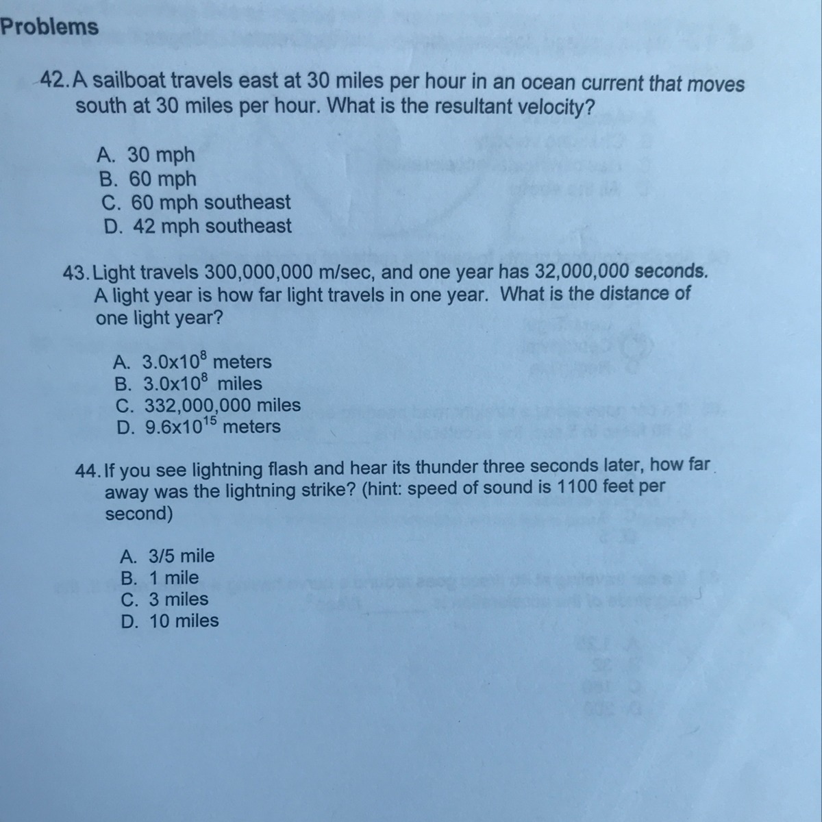 44) For the purpose of the problem, we can assume that the light travels instantaneously from the flash to us (because the distances involved are very small), so the time between the flash and the thunder corresponds to the time it took for the sound to travel to us.