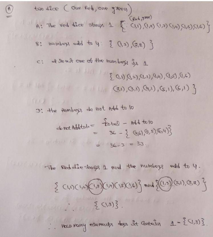 A. Suppose two dice (one red, one green) are rolled. Consider the following events. A: the red die shows 1; B: the numbers add to 4; C: at least one of the numbers is 1; and D: the numbers do not add to 10. Express the given event in symbols.