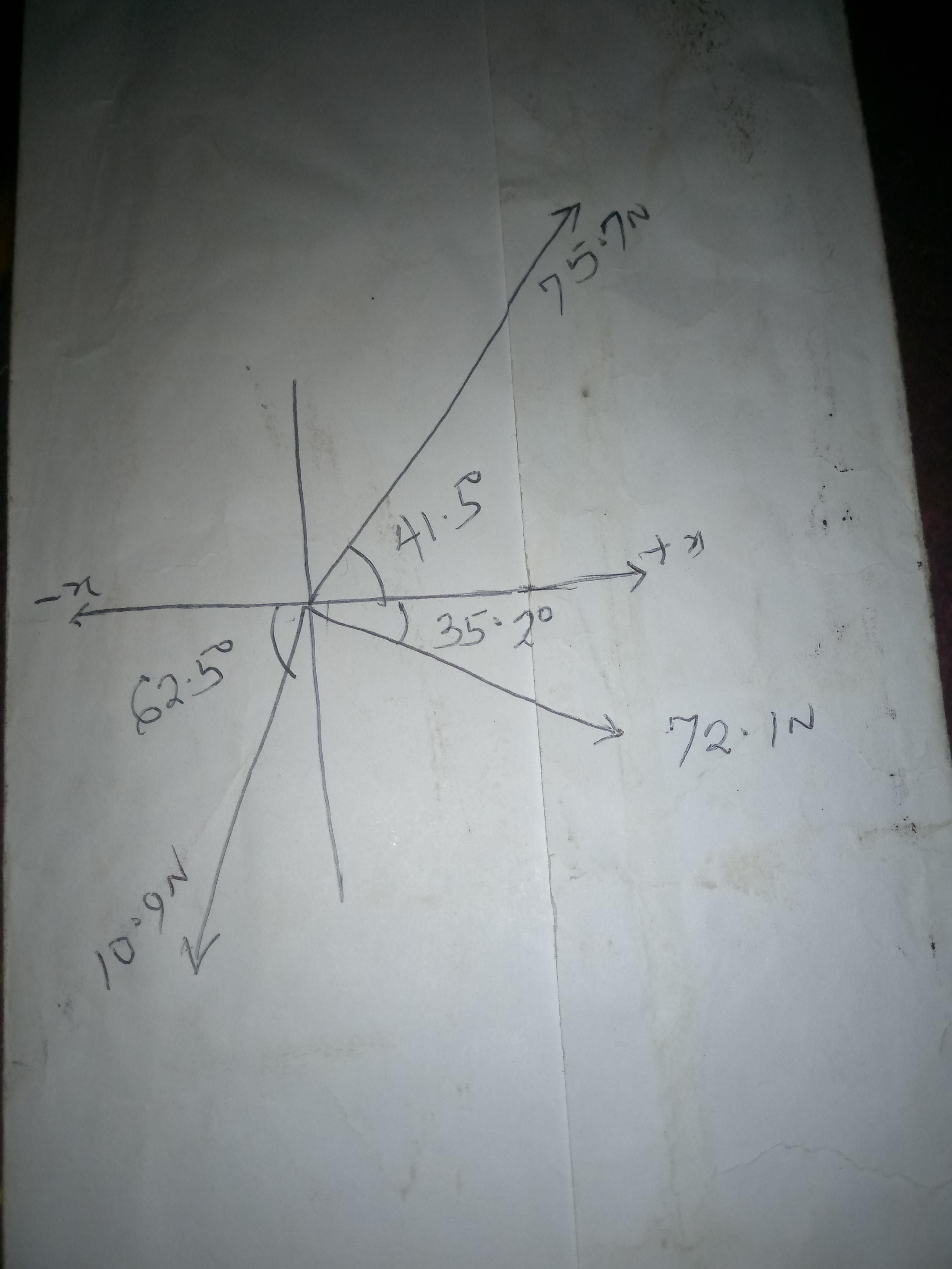 ΣFx = 75.7cos41.5° + (-10.9cos62.5°) + 72.1cos35.2°