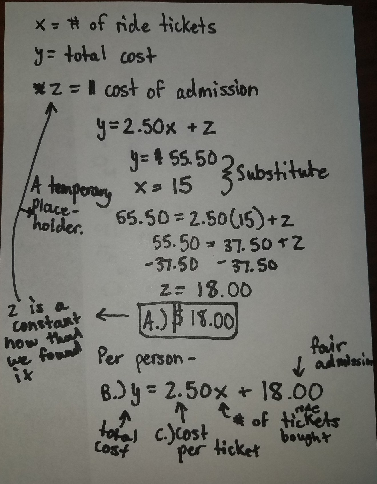 (B) Write a linear equation that can be used to determine the cost for anyone who pays for ride tickets and fair admission.