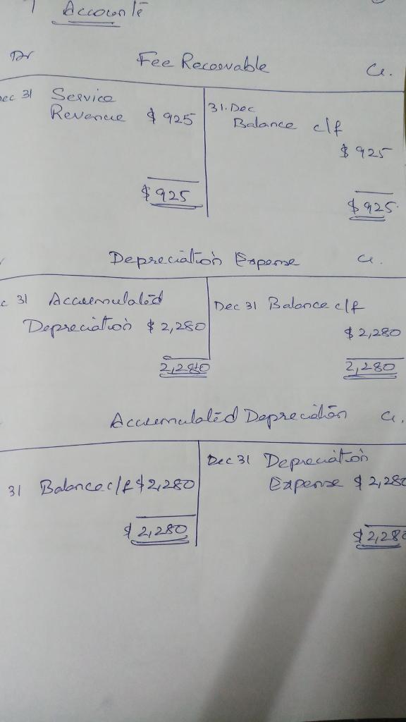 1. Photography services of $925 have been rendered, but customers have not yet paid or beern billed. The firm uses the account Fees Receivable to reflect amounts due but not yet billed.