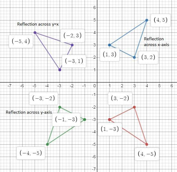 The vertices of triangle after reflation across x-axis are (1,3), (3,2), (4,5).