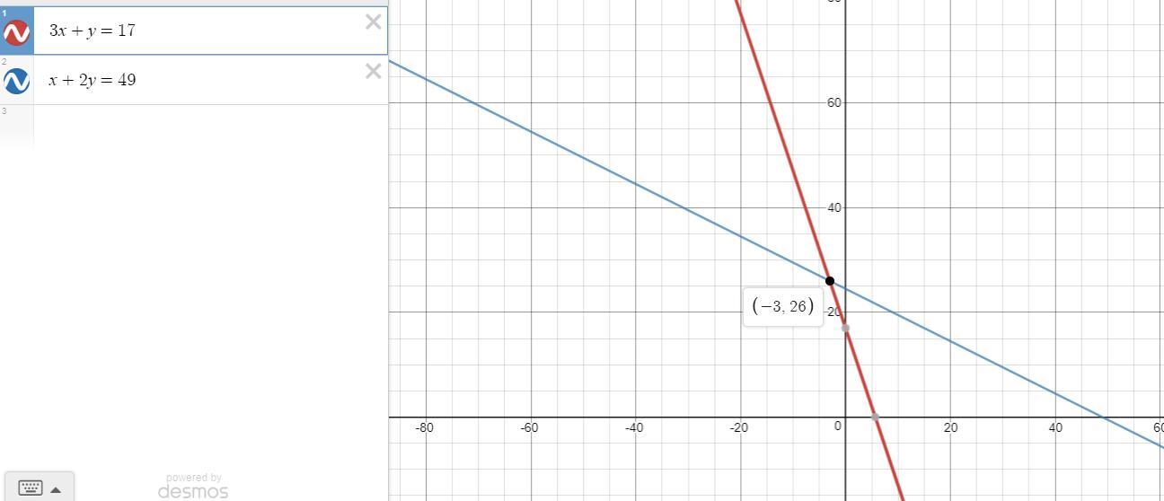 Several techniques do exist for solving systems of linear equations; substitution method, graphical method and elimination method. For this scenario, since we are not restricted on the method, I opted to use the graphical technique.