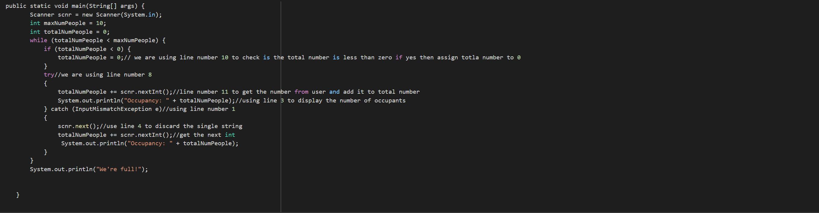 <em> totalNumPeople = 0;// we are using line number 10 to check is the total number is less than zero if yes then assign totla number to 0</em>