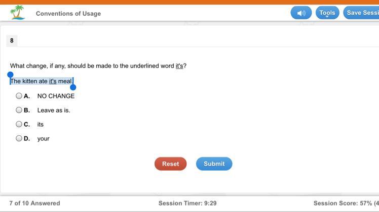 The answer is C. It isn’t no change because if you say it’s, you are saying it is meal which isn’t right. It’s not your because the cat is not you. Leave as is is the same as no change so it’s also wrong.