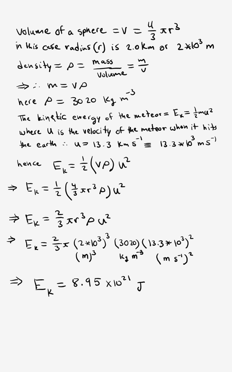 a threat to life on Earth. Assume a spherical asteroid has a mass of 3020 kg for each cubic meter of volume and moves toward the Earth at 13.3 km/s. How much destructive energy could be released when it embeds itself in the earth?