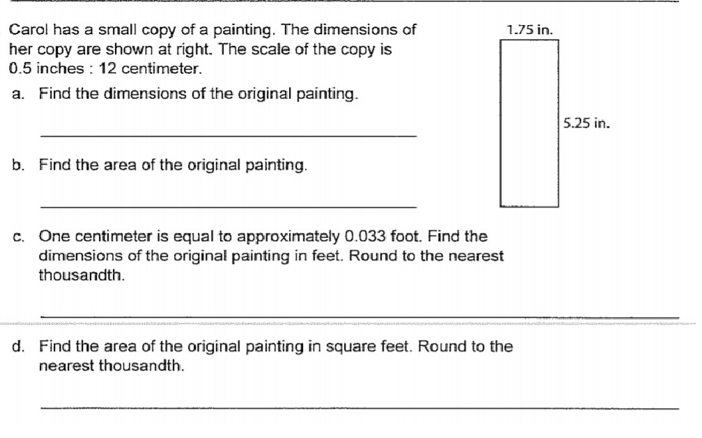 </span><span>One centimeter is equal to approximately 0.033 foot. Find the dimensions of the original painting in feet.