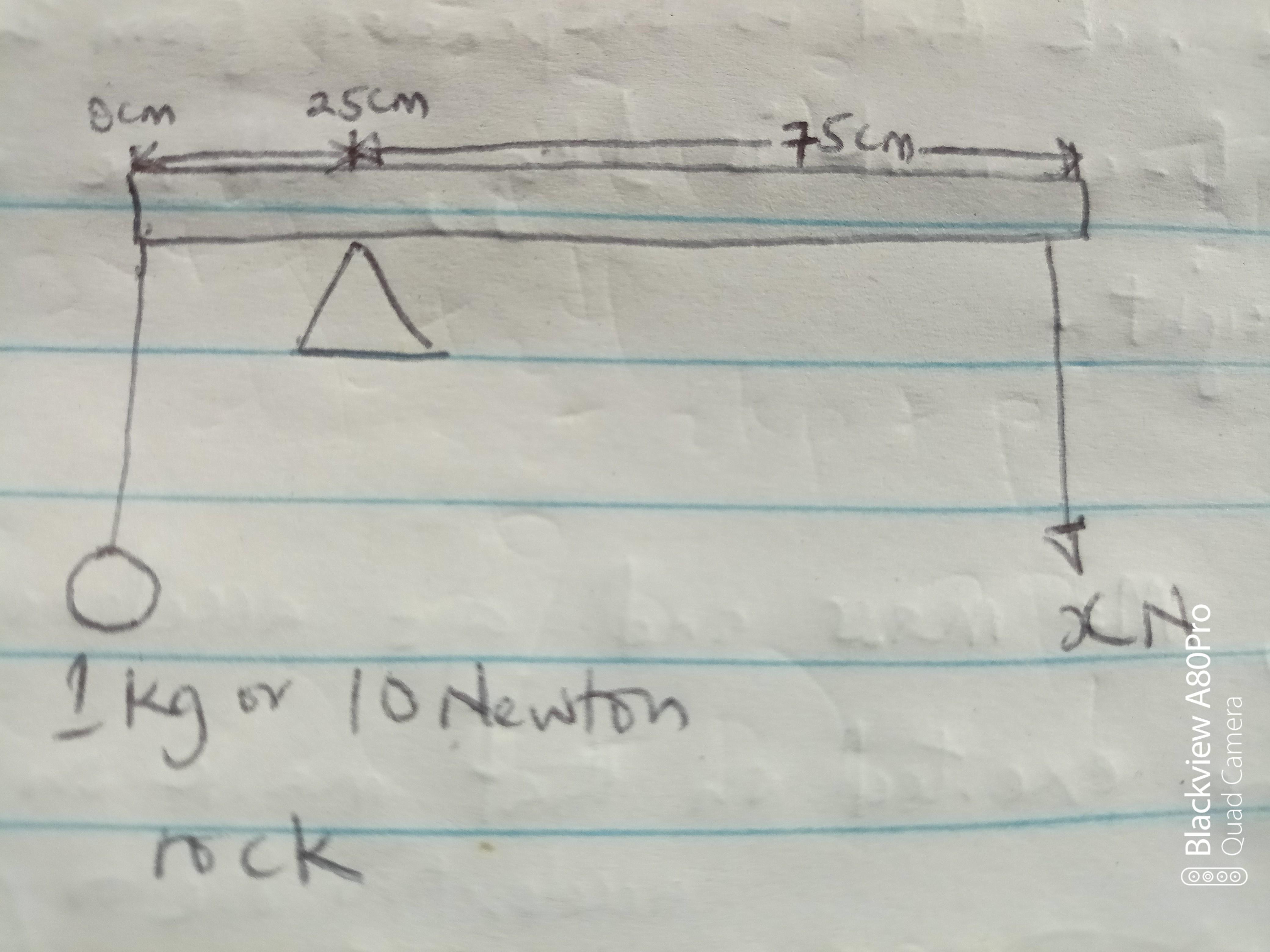 If the stick balances like a seesaw when the fulcrum is at the 25cm mark, it means that the distance of the rock from the fulcrum from the point where the rock was suspended (the 0cm mark) is 25cm. This left hand side of the fulcrum is the anticlockwise moment region.
