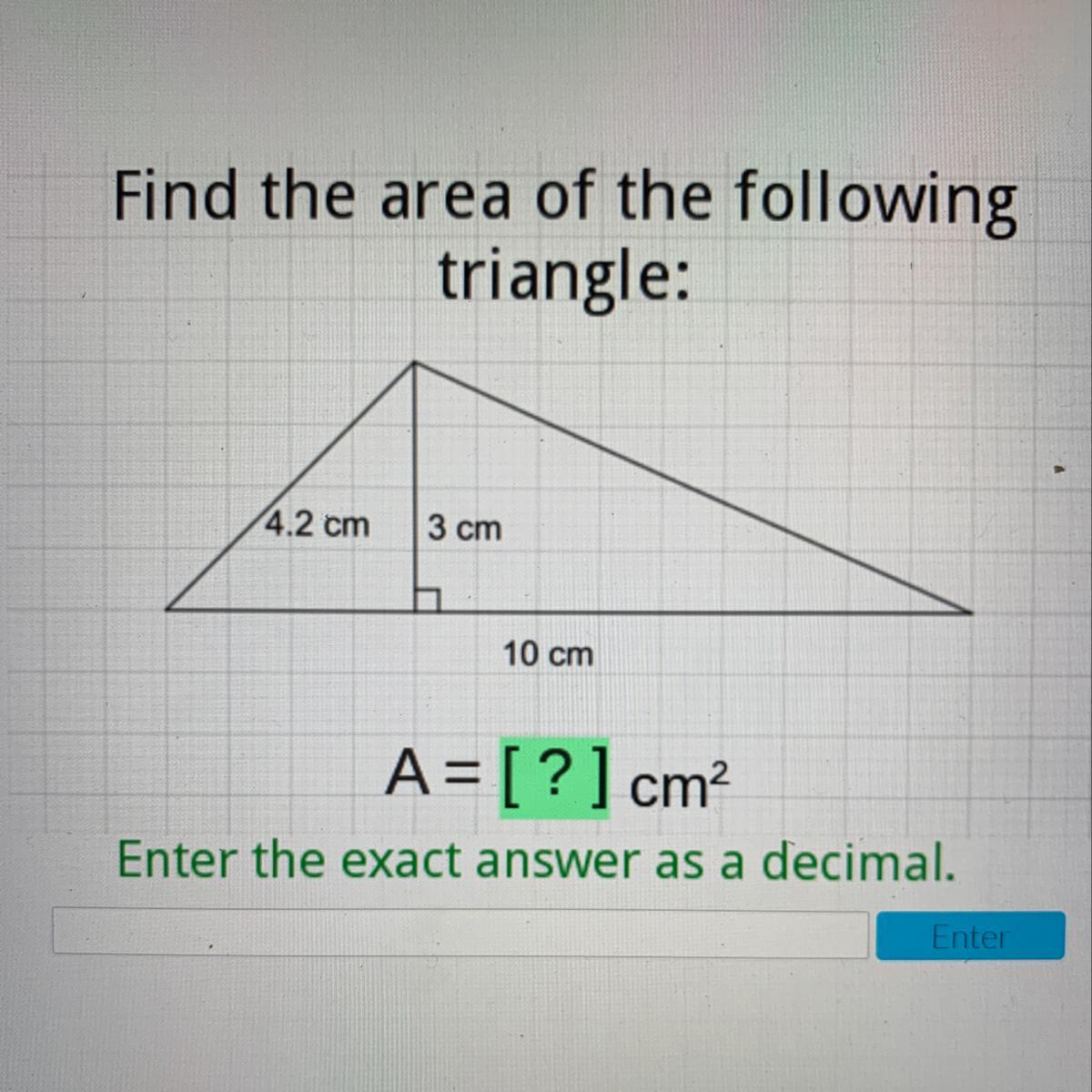 area= 1/2*10 cm*3 cm = 15 cm²