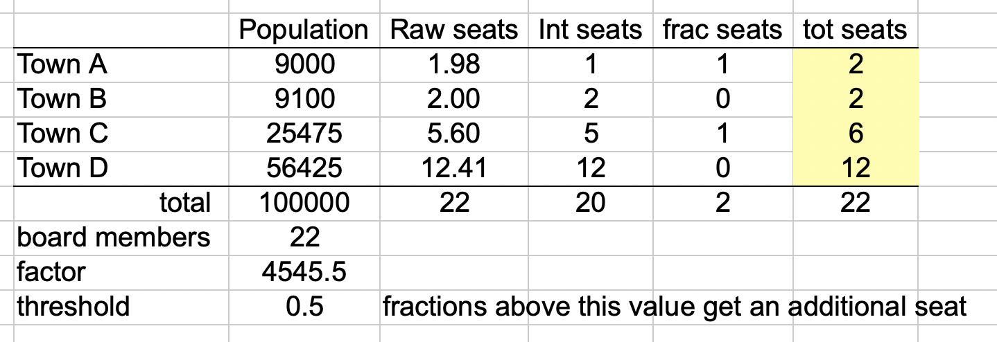 3. The "factor" (persons per board member) is about 4500, so we don't expect a move of 900 people to make any difference in the allocation. These results make complete sense.