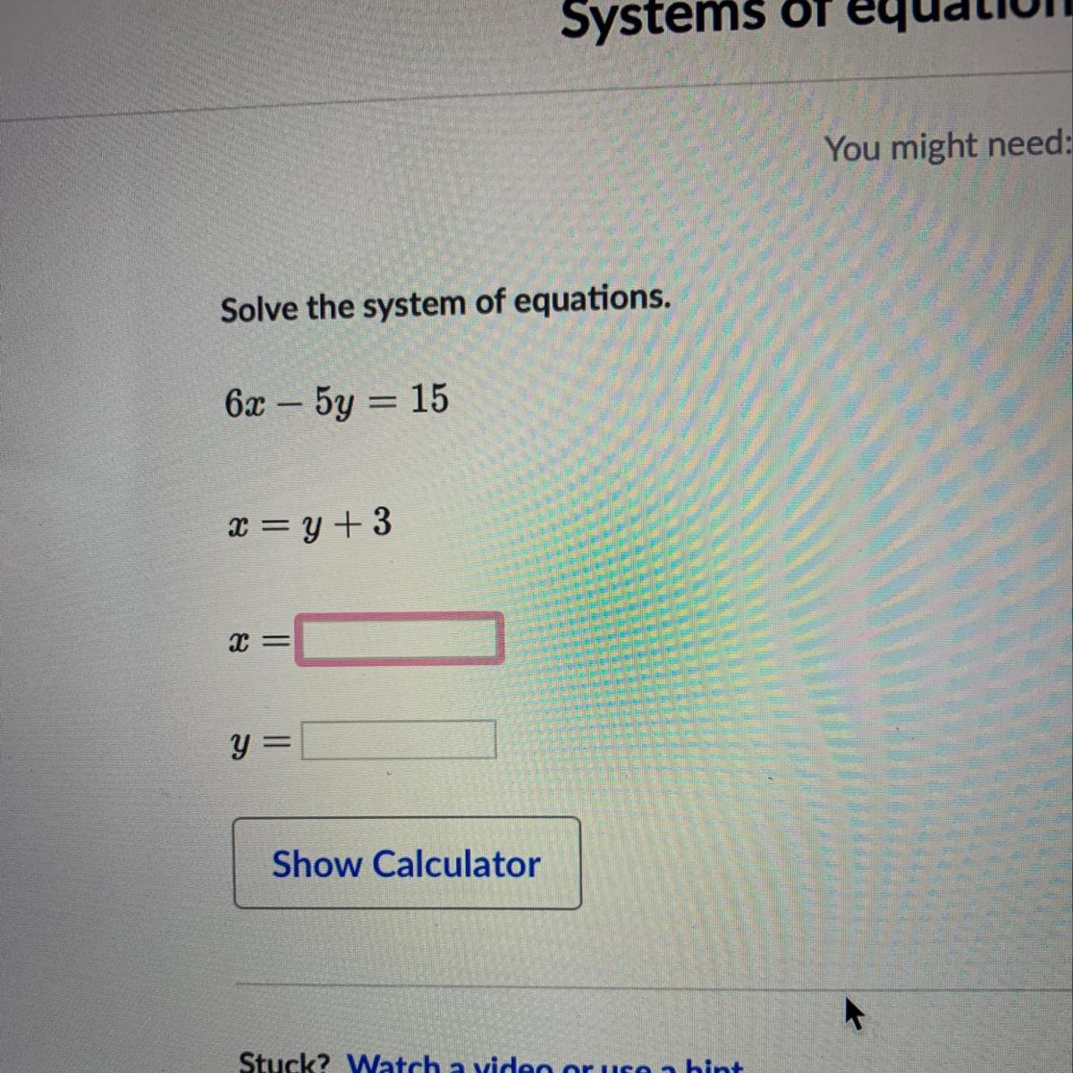 The solution for equation 6x-5y=15 and x=y+3 are