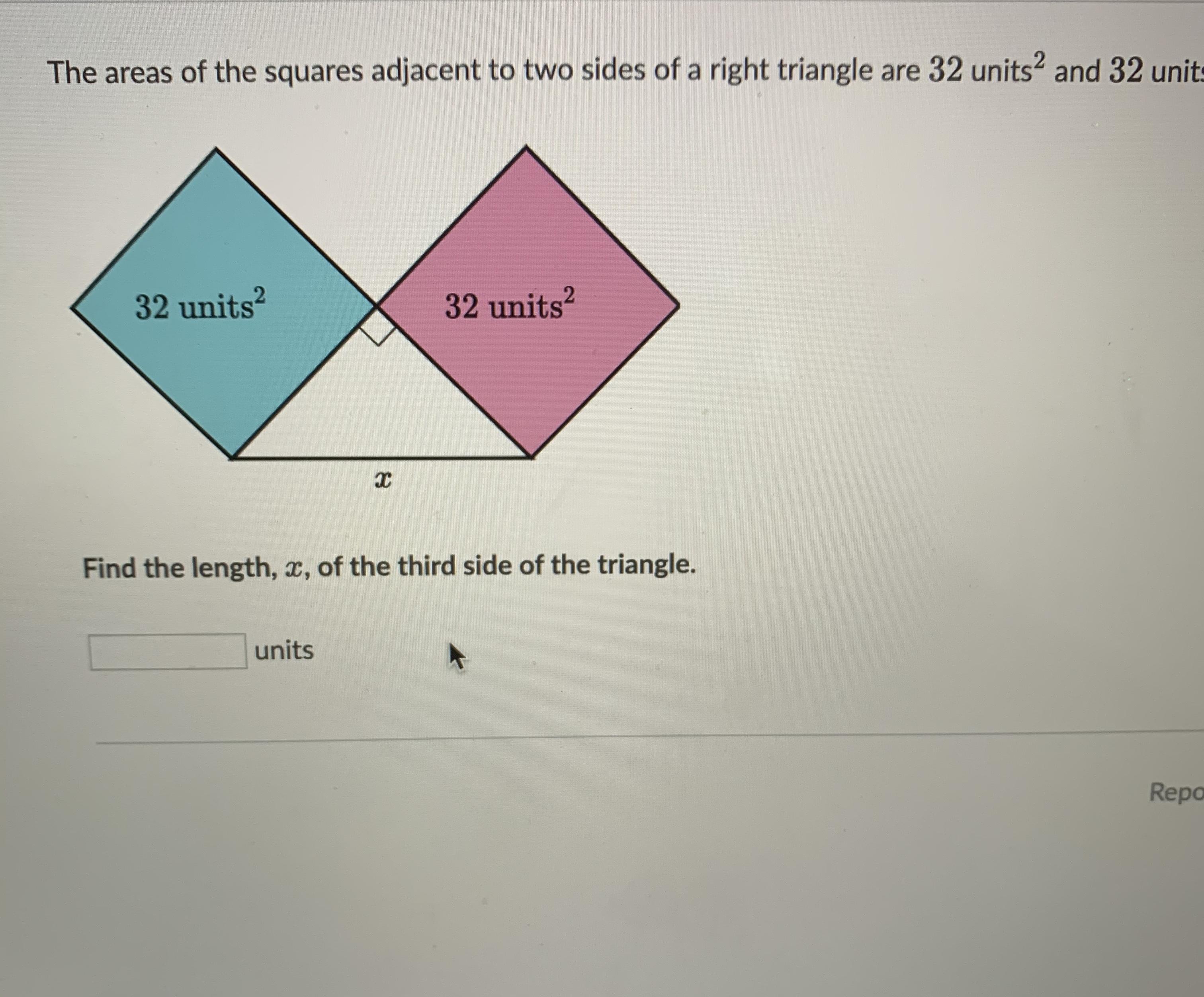 Therefore, the length of the square is √32 units. This implies that the length of both side of the triangle is √32 units