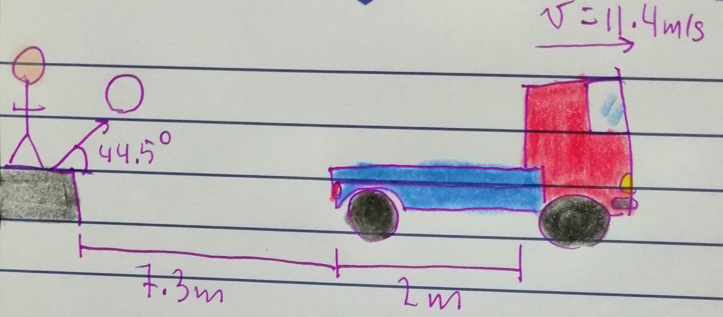We can leave that equation there by the time and start analyzing the movement of the truck. We can determine the distance between the back of the truck and the initial position of the ball with the following equation:
