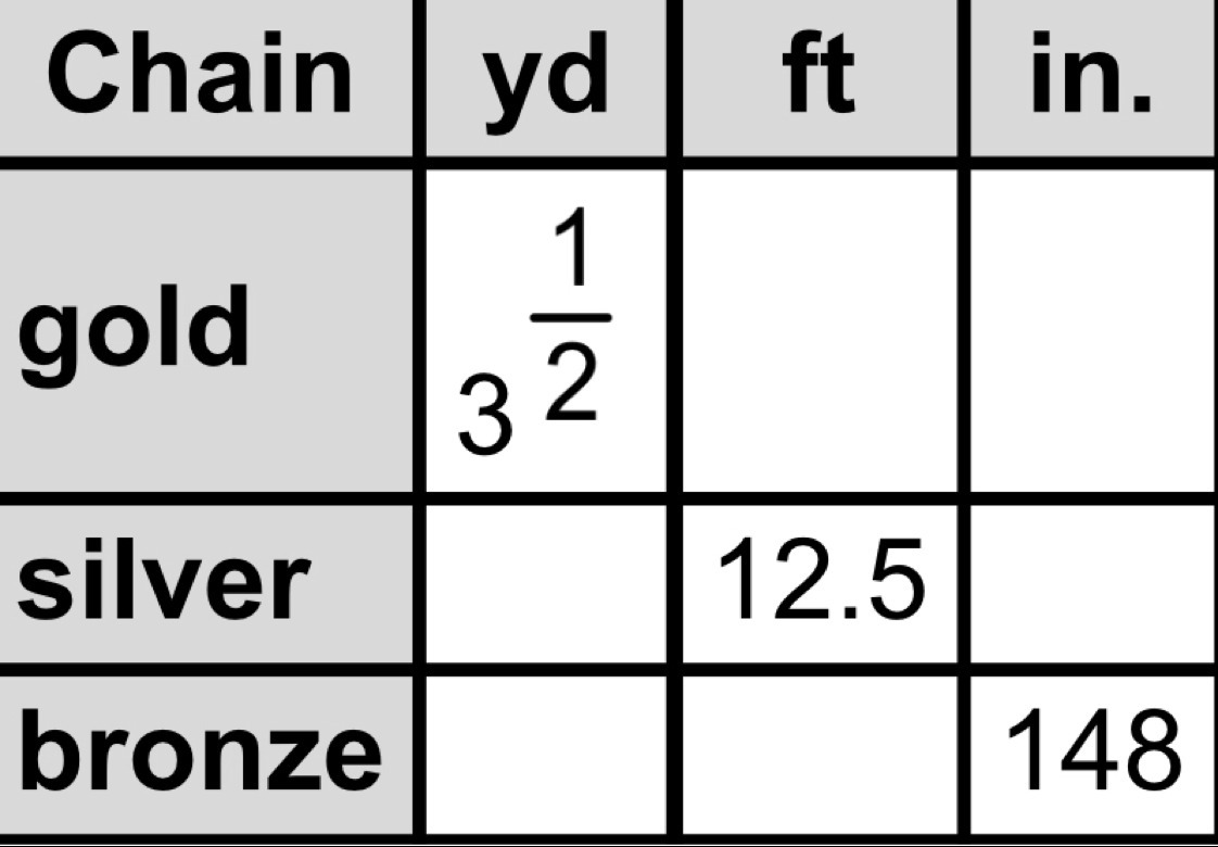 Silver: 4¹/6 yards = 12.5 feet = 150 inches