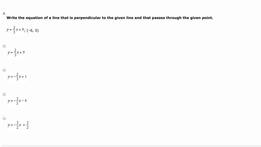 y = mx + b, or (here) 5 = (-3/2)(-6) + b. From this we see that b = -4, and the desired equation is y = (-3/2)x - 4 (Answer Choice #3)