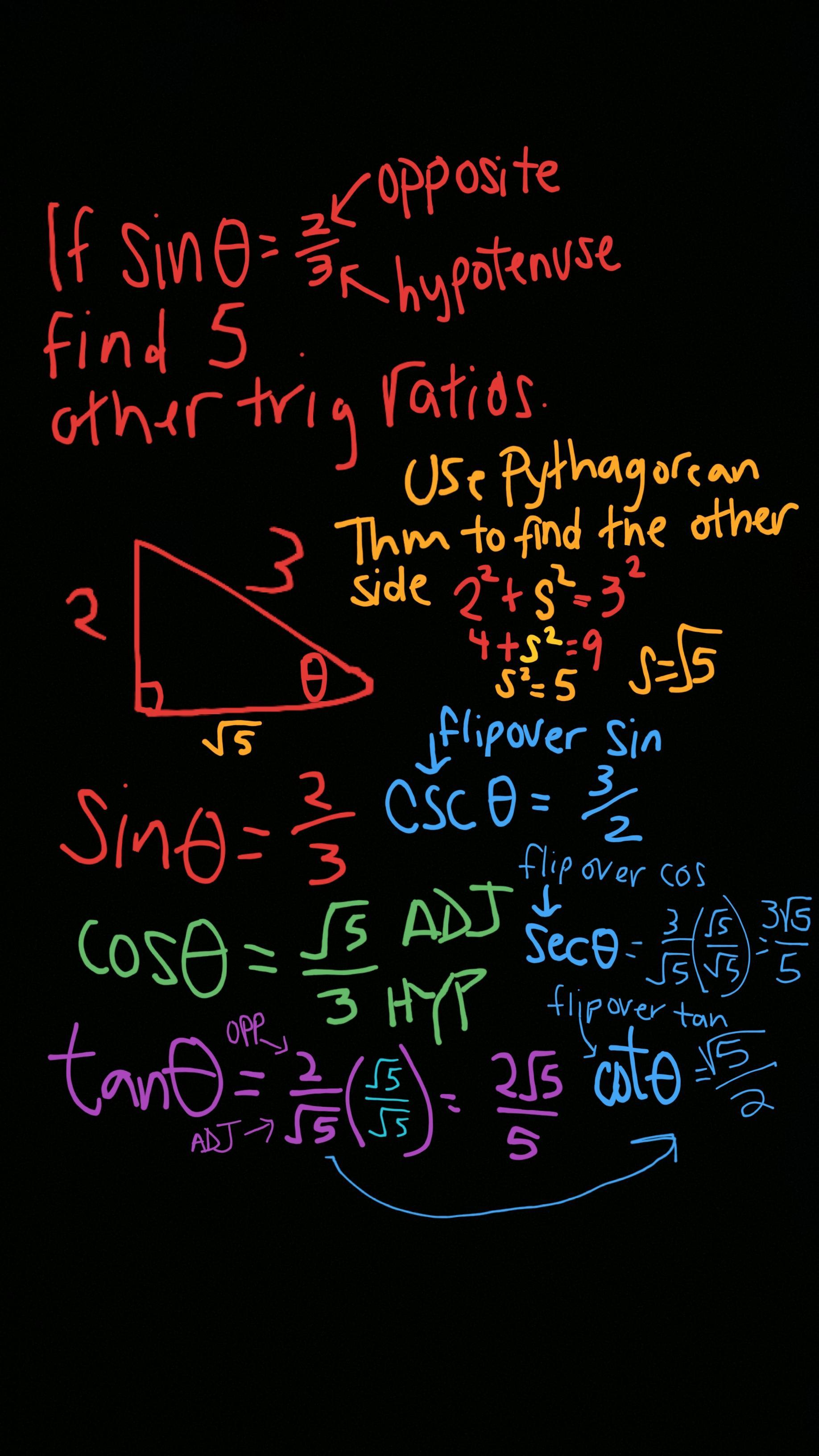 It helps a lot to draw a triangle. Sin is OPPOSITE/ HYPOTENUSE. You can use Pythagorean thm to find the third side. Then use cos = ADJ/HYP