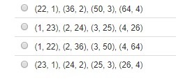 From only this result we know that the correct option is the third, starting with (1,22). Only for verification, below are the other y-values' calculations. y(2)=14×2+8 ⇔ y(2)=36 y(3)=14×3+8 ⇔ y(3)=50 y(4)=14×4+8 ⇔ y(4)=64