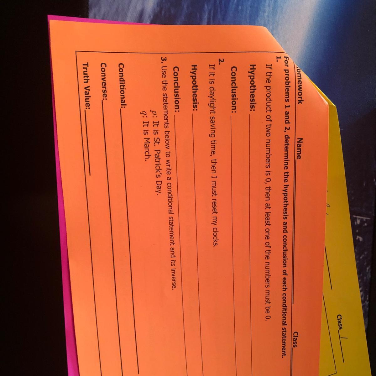 In problems 1 and 2, you are asked to identify the <em>hypothesis</em> and <em>conclusion</em> in each if ... then ... statement. The hypothesis is the clause between "if" and "then"; the conclusion is the clause following "then."