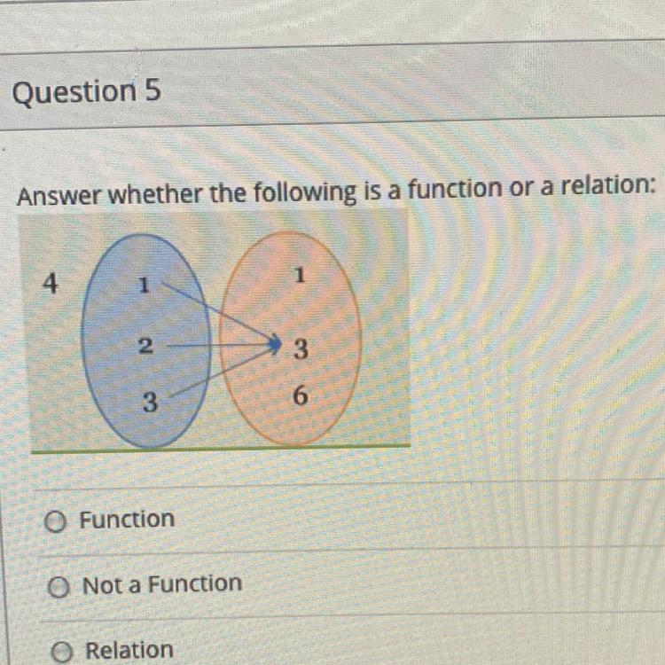A function is a relation where each x-value has only one y-value. In this problem, all the x-values have a y-value of 3. It is a function because even though they all share the same y-value, they don't have more than one y-value. It would be a relation but not a function if one x-value had two y-values.