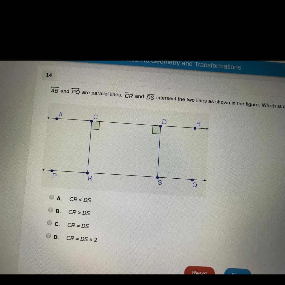 Line segment CR and D S ,are Transversal to parallel lines, AB and P Q.