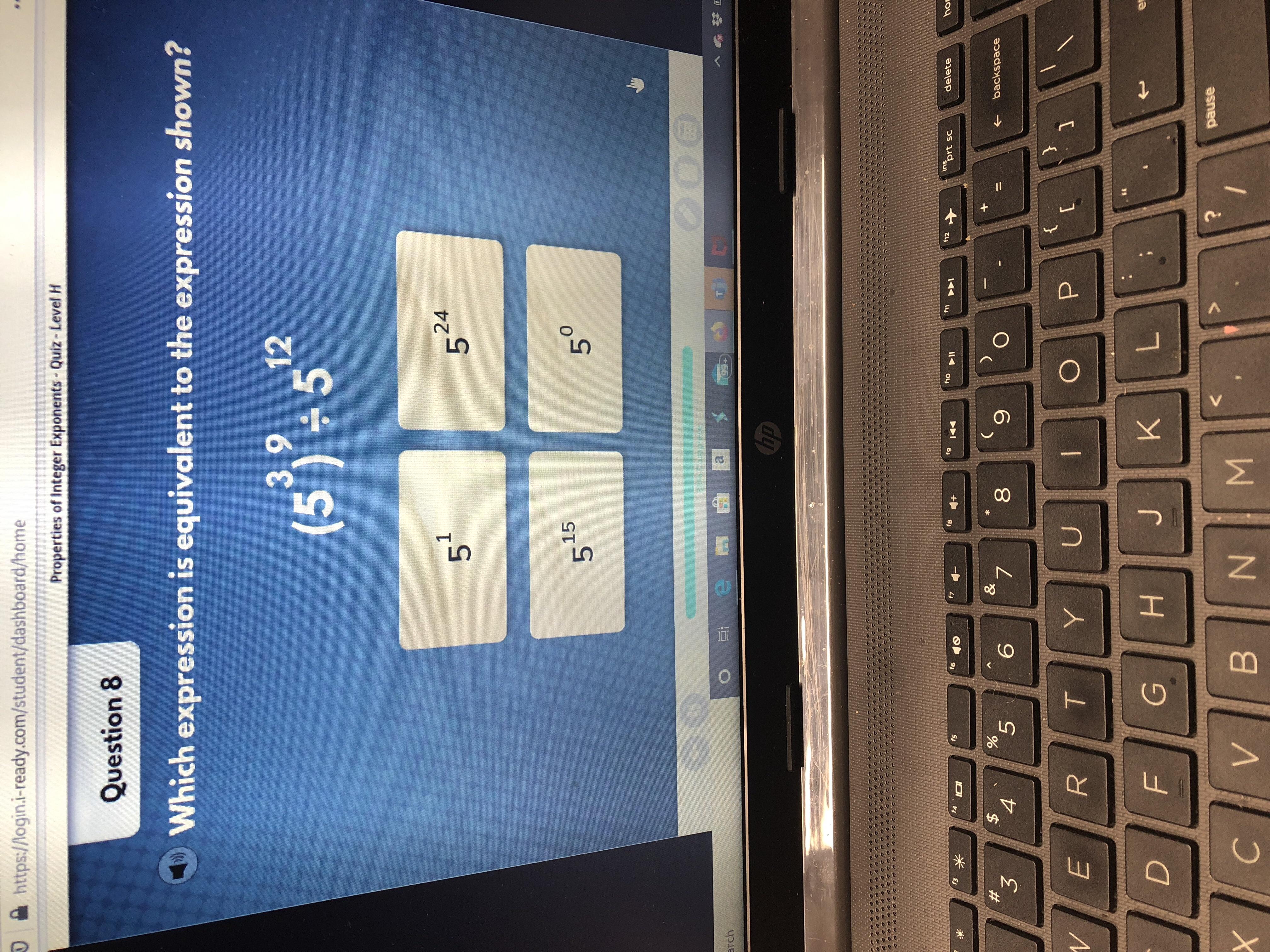 Multiply the exponent that is inside the parentheses (3) by the exponent on the outside (9) to get 27 for the exponent, then subtract the exponent that is divided (12) to get an exponent of 15, which makes the answer 5^15.