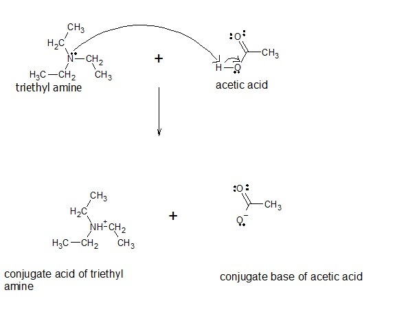Due to the lone pair of electron present on nitrogen in ethylamine, it will behave as base and attack on the hydrogen of hydroxy group of acetic acid, which is an acid and results in the formation of conjugate acid of triethyl amine and conjugate base of acetic acid.