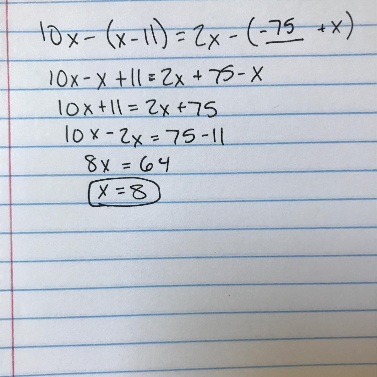 It turns into a positive and ends up with x=8