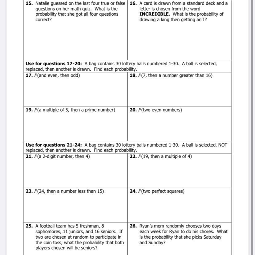 16: Like before: you have pick a king with probability 4/52 = 1/13 (there are four kings - one for each suit, out of 52 cards in a standard deck), and you pick "I" from "INCREDIBLE" with probability 2/10 = 1/5 (there are two "I"s out of 10 letters). So, the probability of picking a king and then an "I" is