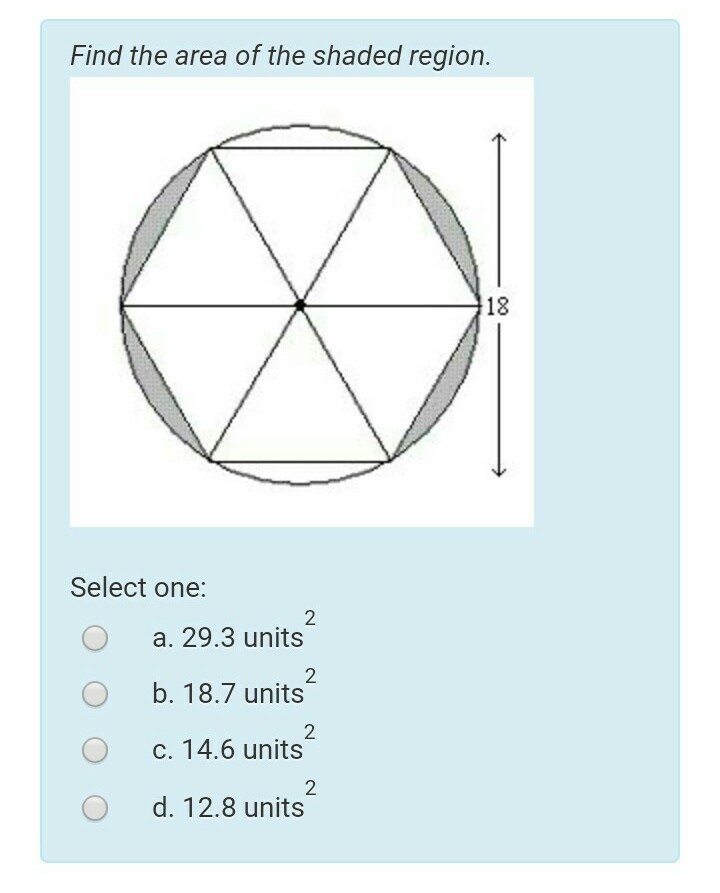 AS there are 4 shaded segments the answer is 4 *7.338 = 29.3 units^2