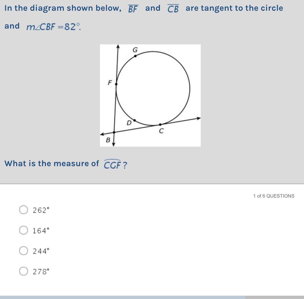 The relationship between the angle at B (82°) and the arcs of the circle, CGF and CDF, is that the angle is half the difference of those arcs. Of course the sum of those arcs is 360°, since together they make a full circle. So. we have ...