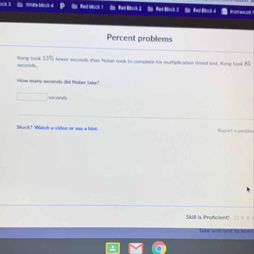 Kong took 15% fewer seconds than Nolan took to complete his multiplication timed test. Kong took 85 seconds