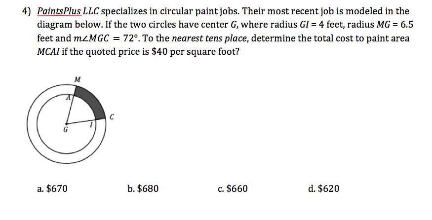 The area of the arc can be computed as the product of the length of its centerline and its width. The centerline has a radius of 5.25 ft (= (4+6.5)/2) and subtends an angle of 72π/180 radians. Thus, the area is ...