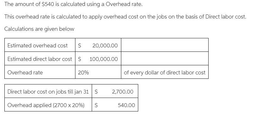 ts total direct labor costs of $100,000 and total overhead costs of $20,000. On January 31, the direct labor for this job equals $2,700. Complete the necessary January 31 journal entry to apply overhead by selecting the account names and dollar amounts from the drop-down menus.