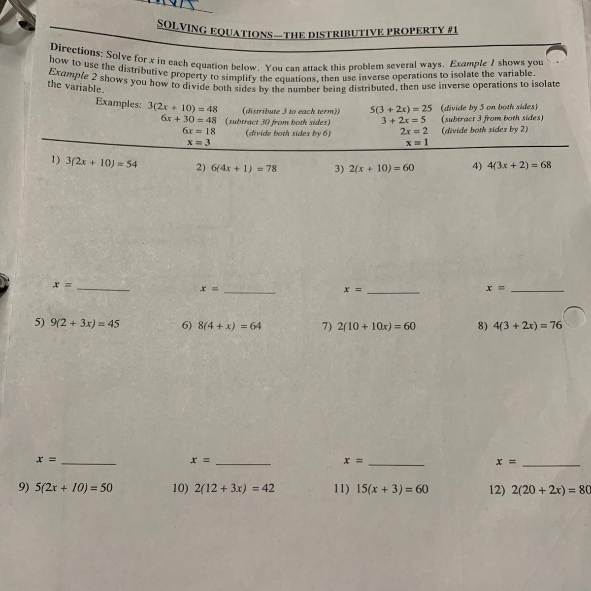 So what you do for distributive property is take #1 for example: 3(2x + 10) = 54. When there’s a parenthesis, you take the outside number which is the 3 times the numbers inside the parenthesis. So after doing that first step you should get 6x + 30 = 54. Now you want to get rid of the 30 so you do 30-30=0 but you have to do it on the other side as well. So subtracting 30 on both sides you should have 6x = 24. Now you want to get x by itself. The opposite of multiplying is dividing so you divide 6 from 6x. So the same on the other side. You get your answer x=4 if you did everything correct