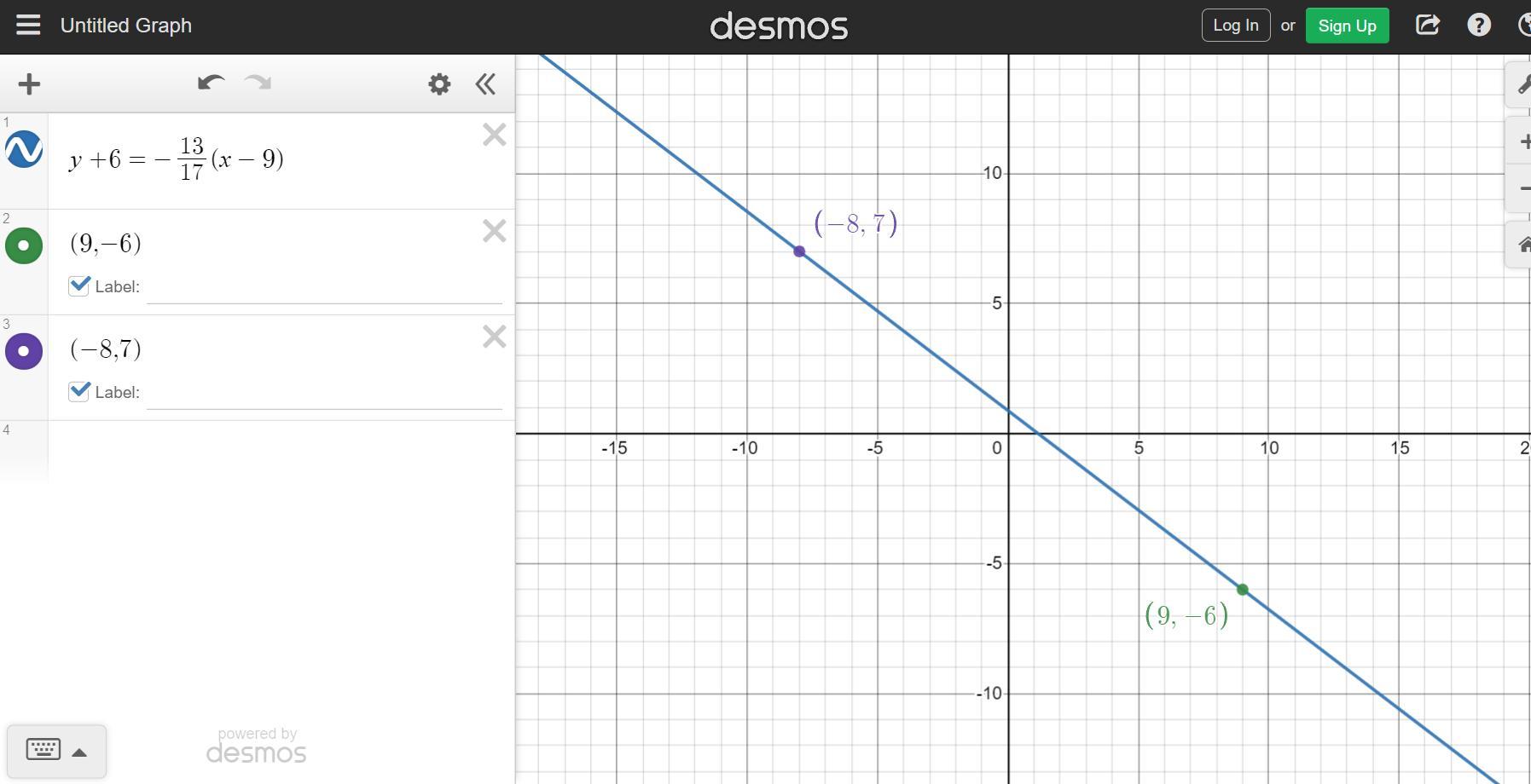The question gives us two points, (9,-6) and (-8,7), from which we can find the slope and later the equation of the line.