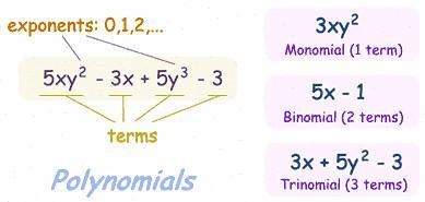 polynomials- A polynomial is an expression that consist with variables and coefficients that involves only subtraction,addition,division,or multiplication.