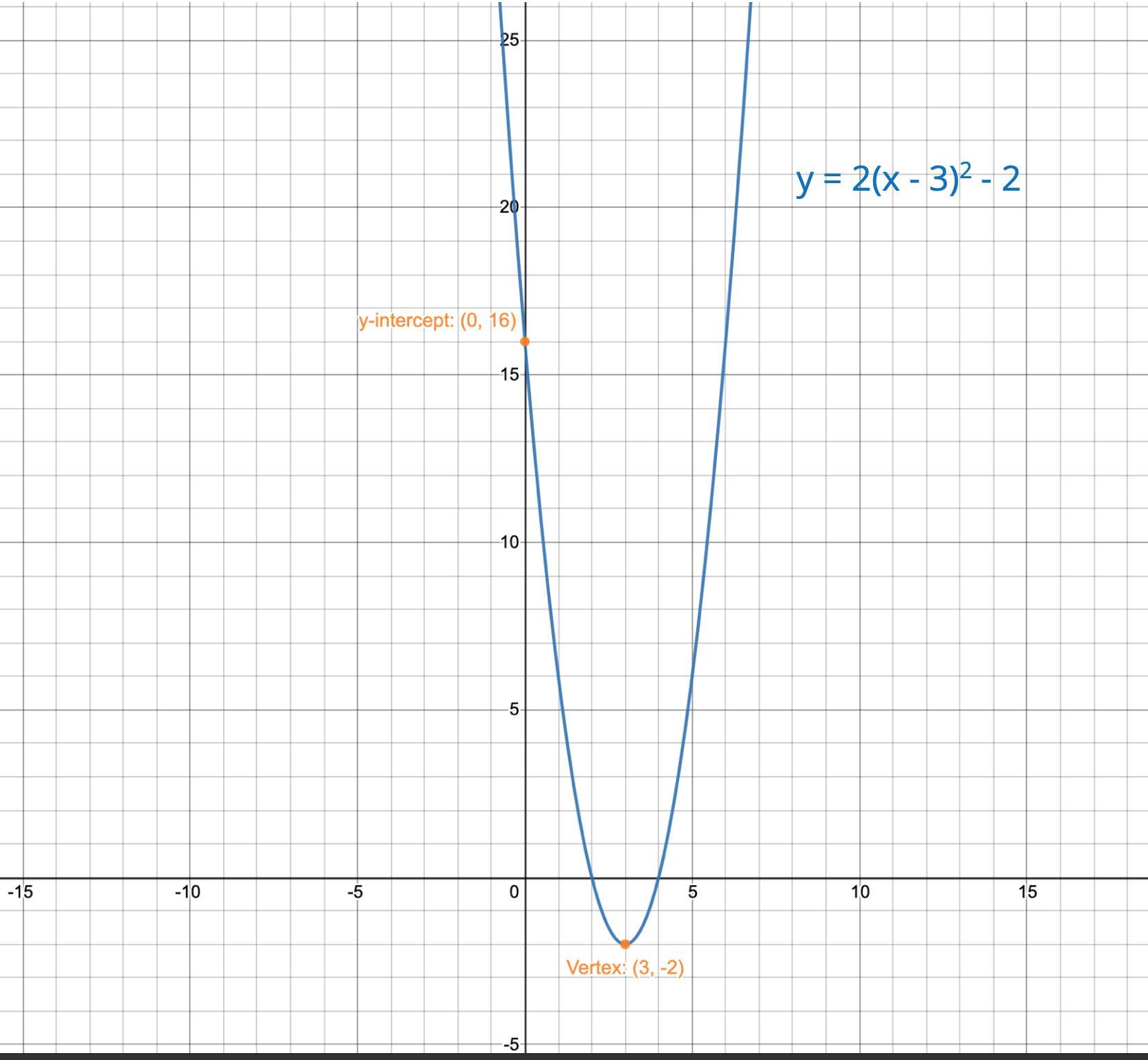Attached is a screenshot of the graphed equation, where it shows the y-intercept and the vertex.